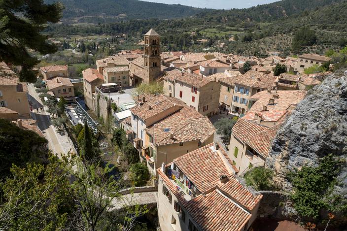 Église, remparts, chapelles, aqueduc, fontaines, ruelles animées et façades colorées… Moustiers-Sainte-Marie se trouve entre le Lac de Sainte-Croix et des Gorges du Verdon. C'est l'un des plus beaux villages de Provence, un village dans la roche, entouré de champs d'oliviers et d'amandiers. Le lieu est reconnu pour sa production de faïence, on peut s'arrêter dans un atelier traditionnel. Dans ce village, il y avait tous les ingrédients pour fabriquer de la céramique : de l'eau et du bois en abondance, une terre argileuse.